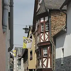 Das Moselkerner Rathaus von 1535 ist das älteste Rathaus an der Mosel, das (wieder) als solches genutzt wird. Es ist ein 9 m breiter, 14 m hoher und 18 m tiefer Fachwerkbau mit einer Kapelle im ersten Obergeschoss. In seiner fast fünfhundertjährigen Geschichte diente es unter anderem auch als Schule und ab 1789 für einige Jahre während des Neuaufbaus der Pfarrkirche als Notkirche.[10] 1907 wurde in dem Gebäude ein kleines Kloster der seit 1903 in Moselkern ansässigen Dienerinnen des Heiligsten Herzens Jesu eingerichtet, das bis 1969 bestand. Aufgabe von drei Schwestern des Ordens war die Betreuung junger Fabrikarbeiterinnen, die seit 1903 in Arbeiterhäusern der Haanschen Wollfabrik außerhalb der Ortslage im Elztal untergebracht waren. Dazu gehörte außer dem Schutz vor Gefährdungen unter anderem eine Nähschule. Vor allem aber sollten nicht mehr schulpflichtige Mädchen in Haushalt und Handarbeiten unterwiesen sowie Kinder in einer „Kleinkinderbewahranstalt“ versorgt werden. Pfarrer Alois Conrady, neben dessen Pfarrhaus die Kinderbewahranstalt vorübergehend im Gartenhaus untergebracht war, hatte das fortan „Haus Nazareth“ und im Volksmund „Klösterchen“ genannte alte Rathaus gekauft und seine Restaurierung veranlasst.[11] Die Tätigkeit der zuletzt acht bis zehn Schwestern, die auch die Krankenpflege im Ort übernommen hatten, endete 1969. Danach war das Gebäude noch Kindergarten, bevor es 1971 in Privatbesitz überging und grundlegend saniert wurde. 1997 erwarb es die Gemeinde und seit 2002 ist es wieder Rathaus. Ein kleines Kuriosum am Alten Rathaus ist der im Erdgeschoss eingelassene Metallring, an dem bis zur Französischen Revolution Straftäter festgebunden und dem Spott der Dorfbewohner preisgegeben wurden.[12]
