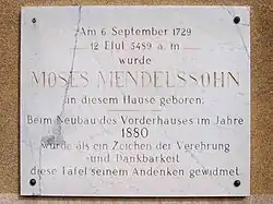 Auf Anregung des Schriftstellers Heinz Knobloch brachte man 1976 am Jüdischen Gymnasium, damals als Berufsschule benutzt, eine Gedenktafel an, die unter anderem auf die Freundschaft des Philosophen zu Lessing hinweist.