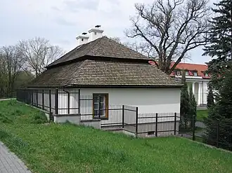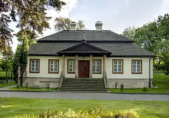 Ein noch bestehendes, eingeschossiges Herrenhaus wurde wahrscheinlich von dem Magnaten Józef Kanty Ossoliński[2] in der zweiten Hälfte des 18. Jahrhunderts errichtet. Er hatte im Jahr 1738 den dortigen Besitz Tarchomin erworben. Zu den früheren Eigentümern gehörten die Familien Wessel und Gołyński. Das neue Herrenhaus war eine Holzkonstruktion mit einem schindelgedeckten Mansarddach und in der damals üblichen Art als schlichter, barocker polnischer Herrensitz ausgeführt. Der als Veranda ausgestaltete Eingang wird von einem auf vier Säulen ruhenden Giebel überdacht. Das Gebäude liegt mit der Rückseite zur Weichsel und wird gegen Hochwasser von einem Deich geschützt. Bis zu seiner Restaurierung in den 2000er Jahren waren die Außenwände verputzt und das Dach mit Teerpappe belegt.
