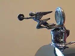 Boyce-Motometer mit Art déco Verzierung auf einem Pierce-Arrow von 1919. Die Schwingen dienen als Handgriff um den Kühlerverschluss samt Motometer nach vorn zu klappen. -