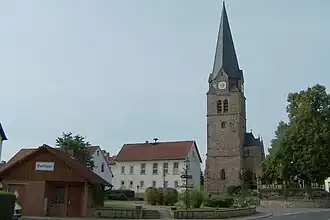 Im Zentrum des Dorfes erhebt sich die neogotische Kirche mit dem noch vom Vorgängerbau erhaltenen Glockenturm. An der Stelle der heutigen Kirche stand zuvor eine Wehrkirche, die bis auf das Jahr 1479 zurückgeht, und von der noch eine Schlüsselscharte am Turm erhalten ist. Zu den spätgotischen Kostbarkeiten des Gotteshauses zählen das Kruzifix und die kleine Pieta im Turm, eine Figur des heiligen Valentinus in der Sakristei sowie Darstellungen der Muttergottes und des heiligen Johannes auf dem linken Seitenaltar. Im Laufe seiner Geschichte wurde das Gotteshaus barock umgeformt. Aus dieser Zeit sind die lebensgroßen Figuren des heiligen Valentin und der heiligen Barbara an den Seitenwänden. Anfang des 19. Jahrhunderts wurde das undichte Dach der Kirche zu einem ständigen Problem. In den 1860er-Jahren setzten zwei heftige Stürme dem Kirchendach zu und 1879 schlug ein Blitz ein. Am 5. Oktober 1909 war die erneuerte Kirche nach nur 15 Monaten Bauzeit von Bischof Joseph Damian Schmitt mit einem Pontifikalamt eingeweiht worden.[5] 1968 wurden der neugotische Hochaltar, die Kanzel und die Kommunionbank herausgenommen und die Kirche neu übermalt. Das Sakramentshaus (um 1480) aus dem Turm wurde im Chor auf der rechten Seite eingelassen. 1995 erfolgten umfangreiche Arbeiten an Außenmauern, Dach und Turm. 2002 entschied man sich zu einer grundlegenden Renovierung. Die Statik wurde verbessert, Putz- und Malerarbeiten ausgeführt, der Fußboden erneuert und die Seitenaltäre überholt. Bei der Umgestaltung kamen auch die ehemaligen Altarreliefs des entfernten Hochaltares wieder zu Ehren. Der neue Altartisch wurde von Bildhauer Elmar Baumgarten aus Ebersburg entworfen. Die umfangreichen Renovierungsarbeiten wurden von den Einwohnern des Ortes finanziell und in zahlreichen Arbeitseinsätzen unterstützt.