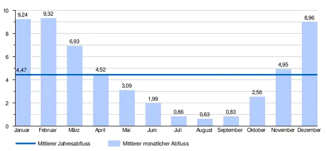 Die Abflusswerte schwanken im Laufe des Jahres recht stark. Die höchsten Wasserstände werden in den Wintermonaten Dezember bis Februar gemessen. Ihren Höchststand erreicht die Abflussmenge mit 9,32 m³/s im Februar. Von Februar an geht die Wasserführung rasch zurück und erreicht ihren niedrigsten Stand im August mit 0,63 m³/s und steigt danach ab Oktober wieder kontinuierlich an.