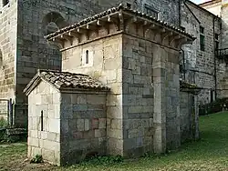Die Dächer haben weit überstehende Dachtraufen, die auf sogenannten Röllchenkonsolen aufliegen, die mit Rosetten und Sonnenrädern verziert sind. Vorbilder solcher Röllchenkonsolen finden sich an der Mezquita von Córdoba. Sie sind noch vorhanden an den Kirchen San Miguel de Celanova, San Miguel de Escalada, San Millán de Suso, Santa María de Lebeña und Santiago de Peñalba.