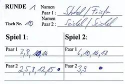 Gespielt werden Spiele, deren Ergebnisse nach regional verschiedenen Verfahren erfasst werden. Meist werden Bobbl gespielt, wobei das Siegerpaar Punkte für ein gewonnenes Spiel erhält. Das Paar, das zuerst einen definierten Spielstand erreicht, gewinnt den Bobbl, die Verlierer bekommen ihn. Mitunter werden mehrere Bobbl auch noch zu einem Hänger zusammengefasst. Teils kommen auch andere (dem Schafkopf entnommene) Verfahren zur Auswertung zum Einsatz.