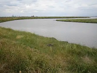 ![]() Der Mucking Creek bei Hochwasser mit der Themse rechts im Hintergrund | ||