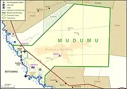 Ausgangspunkt für Mudumu ist die nordwestlich des Parks gelegene Ortschaft Kongola. Der Park wird gegen Westen vom Fluss Kwando begrenzt, der Nordosten des Parks ist eine trockene von Mopane-Bäumen durchsetzte Buschsavanne und im Südwesten wird der Park durch die Linyantisümpfe geprägt, eine für Namibia sehr ungewöhnliche Landschaft: Reetinseln, Flussläufe und Marschen kennzeichnen dieses Gebiet.[2] Der südlich dieser Sümpfe anschließende Linyanti bildet die Südgrenze des Parks und auch die Staatsgrenze Namibias zu Botswana.