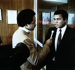 Muhammad Ali (* 17. Januar 1942 in Louisville, Kentucky, Geburtsname Cassius Marcellus Clay Jr.; † 3. Juni 2016 in Scottsdale, Arizona[1]) war ein US-amerikanischer Boxer und der Einzige, der den Titel des unumstrittenen Weltmeisters dreimal in seiner Karriere gewinnen konnte. Bekannt wurde er zunächst unter seinem Namen Cassius Clay (bis 1964).[2] Er gehörte zu den bedeutendsten Schwergewichtsboxern und herausragendsten Sportathleten des 20. Jahrhunderts überhaupt und wurde 1999 vom Internationalen Olympischen Komitee zum „Sportler des Jahrhunderts“ gewählt.[3] Vor allem die in den 1970er Jahren über TV weltweit ausgestrahlten Boxkämpfe mit Joe Frazier (3-mal, 1971–1975), Ken Norton (3-mal, 1973–1976) und der Rumble in the Jungle gegen George Foreman (1974) gelten als Klassiker unter den Schwergewichtskämpfen.