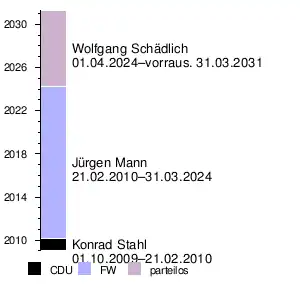 Bei der Bürgermeisterwahl 2024 wurde Einzelbewerber Wolfgang Schädlich mit 56,8 % gegen Mitbewerber Philipp Sandner (CDU, 43,2 %) gewählt. Mann trat nicht mehr an.[10]