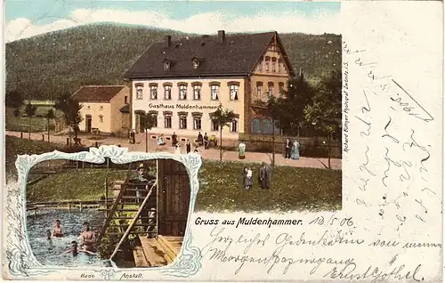 Das Hammerwerk an der Zwickauer Mulde wird im 16. Jahrhundert als Hammer untern Eybenstock genannt. Als erster bekannter Hammermeister ist Hans Dietz[1] überliefert, unter dessen Führung nur „solche Sachen, die beym Hauß-Wesen unentbehrlich waren“ gefertigt wurden. Erst Jacob Kleinhempel, der Schwiegervater von Melchior Siegel,[4] richtete 1531 einen Waffenhammer[1] ein und erhielt am 12. März 1588[5] als einer der ersten erzgebirgischen Hammerherren – nachdem die Laufzeit des Marx Röhling und dessen Erben erteilten Monopols für den Betrieb von Hochöfen in Kursachsen endete[6] – die Konzession zur Erbauung eines Hochofens zum Schmelzen des Eisensteins. Es war ein Bauwerk von einer Höhe von 6 bis 8 Metern und konnte täglich eine Tonne Eisen produzieren.[1] Bis Mitte des 17. Jahrhunderts blieb der Hammer im Besitz der Familie Kleinhempel. Daher kam die Bezeichnung im Volksmund der Kleinhempel für das Hammerwerk.[1] In der Folge sind als Besitzer die Familien von Uttenhoven und Gottschald und 1748 Johann Paul Vogel nachweisbar.[7] 1788 bestand der Muldenhammer aus einem Hochofen, zwei Frisch- und Stabfeuern sowie einem Zinnhaus.[8] Als 1797 gemeinsam mit den Hämmern in Neidhardtsthal, Schönheiderhammer und Unterblauenthal die Hammergerechtigkeit erworben wurde, wurde dem Muldenhammer nur ein Zainhammer vorbehalten und der Hochofen stillgelegt.[9] August Schumann nennt 1819 21 Häuser und die gut eingerichtete Ökonomie des Hammerguts „in einem sehr tiefen u. gewundn., zum Th. felsigen, finstern, aber romantischen Thale, oberhalb der Mündg. des Weißbachs, mit Neidhardsthal rainend“.[10] Bis ins 20. Jahrhundert erinnerten ein Hammergut und ein Gasthaus an die traditionsreiche Eisenverarbeitung vor Ort.