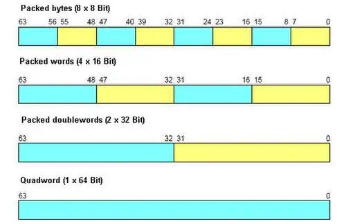 Dabei sind immer nur die niederwertigen Bits 0 bis 31 des MMX-Registers betroffen. Beim Verschieben von Daten aus einem MMX-Register werden also nur diese Bits verwandt. Beim Verschieben von Daten in das MMX-Register wird der höherwertige Anteil (Bits 32 bis 64) gelöscht, also auf Null gesetzt.