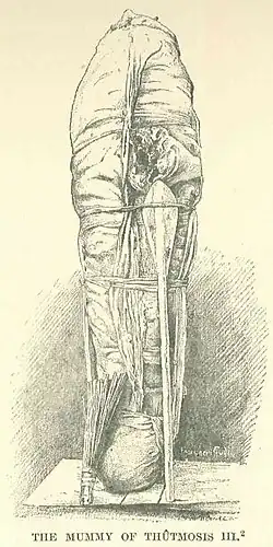 Nach Masperos Schilderung war die Mumie Thutmosis’ III. von den Abd el-Rassuls bereits durchsucht worden. Die 1,60 m lange Mumie war in einem schlechten Zustand und an drei Stellen gebrochen. Sie war mit einem Bouquet von Binsen beschmückt. Das Leichentuch ist mit hieroglyphischen Texten beschriftet, darunter das 27. Kapitel des ägyptischen Totenbuchs und die Sonnenlitanei für König Thutmosis III., Sohn der Königin Isis, deren Name hier zum ersten Mal auftauchte.[4] Um der Bestattung die notwendige Steifigkeit zu verleihen, verwendeten die Umbestatter der 22. Dynastie vier Ruder, drei im Innern und das vierte an der Außenseite. Ein Loch in den Binden auf Brusthöhe dürfte von den modernen Grabräubern stammen, die nach Schmuck suchten.[5]
