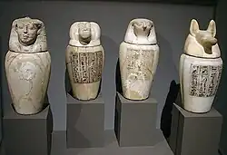 Die nach ihrer Entfernung gesondert präparierten Eingeweide und inneren Organe (Lungen, Gedärme, Magen und Leber) setzte man nach einer Behandlung mit Salböl in vier Krüge – die sogenannten Kanopen. Diese sind Gefäße aus Alabaster, Stein oder Ton, deren Deckel als die Köpfe von vier Schutzgöttern der Eingeweide gestaltet waren, die vier Horus-Söhne. Die Krüge wurden in Kästen aufbewahrt. Die Kanopen sollten die Organe schützen.