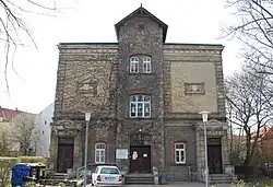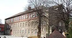 Baubeschreibung: Mischbau aus unterkellertem monolithischem Kernbau mit Fachwerkoberstock, die östliche Giebelseite risalitartig abgesetzter dreigeschossiger Bruchstein-Treppenhausbau, zum Teil verputzt, die mittlere Portalachse zusätzlich als Mittelrisalit mit Satteldach und Sprengwerk-Ziergebinde als vertikale Komponente hervorgehoben, zwei seitliche symmetrische Portalvorbauten mit kräftiger Putzquaderung, der zweiphasige Hauptbaukörper nach Westen (9 + 5 Achsen) als vierzehnachsiger, dreigeschossiger Anbau anschließend, zweiter Oberstock in Fachwerk abgebunden mit profilierten Balkenköpfen und seitlichen Verstrebungen als Halber Mann, das Dachwerk ist ein Pfettendach mit dreifach stehendem Stuhl, die Fensterachsen in den Massivgeschoßen durchgehend mit Segmentbögen ausgeführt, im Fachwerk-Oberstock als stehende Rechteckformate; das Innere zweihüftig mit Mittelflur erschlossen, zum nordöstlichen zweiläufig geraden Massivtreppenhaus mit durchgehender Mittelwangenwand und Zwischenpodesten kommt in der 4. Anbauachse von Westen noch ein zweites massives Erschließungstreppenhaus mit einer zweiläufig geraden Treppenanlage mit Zwischenpodesten hinzu, dieses Treppenhaus wird von Süden durch ein zweiflügeliges Holztor mit Oberlicht erschlossen.