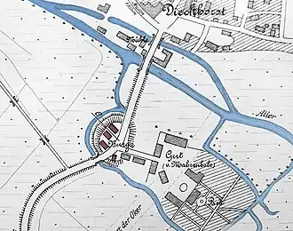 Die Burg lag in der Niederung der Aller, was in dem damals sumpfigen Gebiet einen natürlichen Schutz bot. Ihr genauer Standort ist bis heute nicht sicher nachgewiesen. Aufgrund ihrer Funktion als Münzstätte müssten sich im Boden eindeutig zu identifizierende Reste erhalten haben. 2013 erfolgten archäologische Prospektionsmaßnahmen, zunächst durch Luftbildarchäologie[1] und später mittels geophysikalischer Methoden.[2]