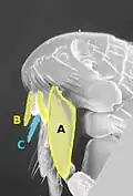 ![]() c: Compositionsauge; a: Antenna; lr: Labrum; md: Mandibel; mx: Maxille; lb: Labium hp: Hypopharynx | ||