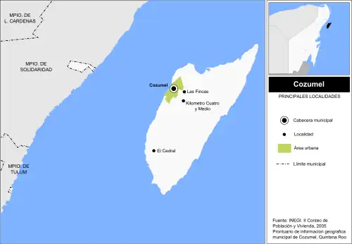 Das Municipio Cozumel umfasst laut Zensus 2020 144 bewohnte Orte, von denen nur der Hauptort vom INEGI als urban klassifiziert ist. Beim Zensus 2020 wiesen sieben Orte eine Einwohnerzahl von über 100 auf. Keiner der bewohnten Orte liegt auf dem Festland.[2]
