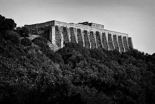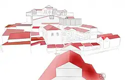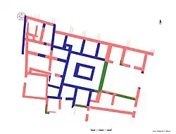Das Fundament des schon 1967 entdeckten Gebäudes besteht aus Opus caementicium, auf dem eine Wand aus Ziegel errichtet wurde, wobei an den verschiedenen Bautechniken in der Art des Opus testaceum und ab dem 1. nachchristlichen Jahrhundert mit Opus mixtum eine chronologische Abfolge der verschiedenen Bauphasen ablesbar ist.