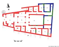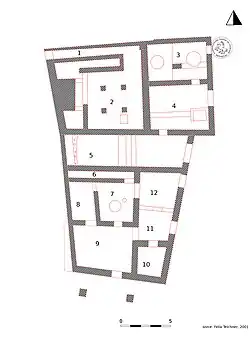 Das im Norden der Siedlung liegende Haus grenzt direkt an das Forum an und ist von diesem durch eine schmale Rampe (1) erreichbar. Direkt an diese anschließend befindet sich ein Raum (2), der auf Grund seiner Säulen als Kellerraum eines darüber liegenden Obergeschosses angesprochen wird. Der nordwestliche Raum (3) wird als Werkstatt mit Ölpresse interpretiert, das direkt südlich liegende Zimmer als Ladengeschäft (4) mit Zugang zur Straße. Der zentrale Raum des Geschosses diente laut Felix Teichner als Geschäfts- und Lagerraum. Von diesem Bereich des Hauses anscheinend abgegrenzt liegenden Räume dienten vermutlich als Wohn- (7, 8, 10) und Geschäftsräume, die mögliche Treppenrampe (6) führte in das Obergeschoss.