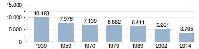 Die Munizipalität hat 3.800 Einwohner (Stand: 2021). Die Einwohnerzahl sank mit 3.795 Einwohnern (2014)[2] gegenüber der vorangegangenen Volkszählung (5.261 Einwohner 2002) um über ein Viertel, erheblich über dem Landesdurchschnitt.[3] Bereits mindestens seit den 1930er-Jahren (10.183 Einwohner 1939) hatte sich die Bevölkerungszahl kontinuierlich verringert.
