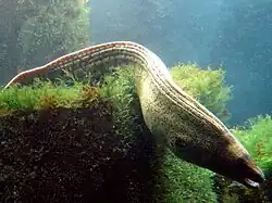 Muränen (Muraenidae) sind eine Familie aalartiger Knochenfische, die mit etwa 200 bisher bekannten Arten in flachen tropischen und subtropischen Meeren verbreitet sind. An den Küsten des südlichen Europa leben zwei Arten: die Mittelmeer-Muräne (Muraena helena) und die Braune Muräne (Gymnothorax unicolor).[1] Besonders häufig sind Muränen in den tropischen Korallenriffen: Bei den Marianen und bei den Marshallinseln werden 54 Arten gezählt, in den Gewässern um Hawaii sind sie mit 32 Arten nach den Lippfischen (Labridae) die artenreichste Fischfamilie.[2]