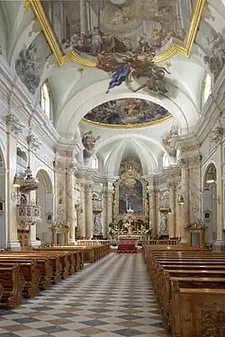 Das Kirchenschiff misst 25,5 × 15,3 m und ist 17,1 m hoch. Es wird von sechs Seitenaltären in nicht sehr tiefen Nischen flankiert. Zwischen ihnen gliedern hohe Pfeiler die Wände, die durch Kapitelle abgeschlossen werden, darüber verläuft ein auskragendes Gesims. Über diesem erhebt sich die Presbyteriumskuppel und das imposante Tonnengewölbe. Zwischen den jeweils zwei Pfeilern, die die Seitenkapellen voneinander trennen, sind Nischen und über diesen vier Oratorien eingebaut. Unter diesen befinden sich die kastenförmigen Beichtstühle. In dreien der Nischen stehen die Statuen der lateinischen Kirchenväter Ambrosius, Hieronymus und Gregor der Große von Caspar Schonger, in der vierten Nische befindet sich an der Nordwand die Kanzel, die 1780 von Andrea Filippini gestaltet wurde.