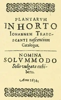 In seinem privaten Reisetagebuch notierte Georg Christoph Stirn 1638, dass im Garten des Musaeum Tradescantianum alle Arten ausländischer Pflanzen seien, ihre Namen wären in einem kleinen Buch enthalten, das Tradescant habe drucken lassen.[38] Dabei handelte es sich um eine Liste von mehr als 750 Pflanzenarten, die 1634 im Garten des Musaeum Tradescantianum in South Lambeth vorhanden waren.[83] Das Buch mit dem Titel Plantarum in horto Johannem Tradescanti nascentium catalogus ist nur in einem einzigen Exemplar in der Bibliothek des Magdalen College in Oxford erhalten.[84] Damit ist es, neben der von John Gerard für seinen Garten in Holborn angelegten Pflanzenliste von 1596, das seltenste gedruckte botanische Werk.[38] Die Erwähnung durch Stirn im Jahr 1638 widerlegt die Auffassung, dass es sich bei dem Buch lediglich um einen unveröffentlichten Probedruck gehandelt haben könnte.[85] Die Erhaltung nur eines einzigen Exemplars wird dadurch erklärbar, dass es sich ungeachtet des lateinischen Titels nicht um ein wissenschaftliches Werk mit den entsprechenden Adressaten handelte, sondern um ein Stück Gebrauchsliteratur für die Museumsbesucher.