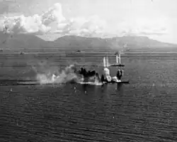 Das letzte Foto der Musashi, gegen 18:00 Uhr vom Zerstörer Isokaze aus aufgenommen. Sie liegt nach dem Ende der Angriffe mit dem Vorschiff tief im Wasser und krängt nach Backbord.