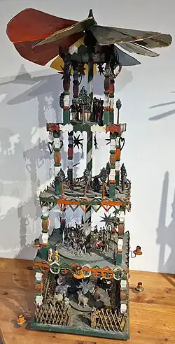 Die bergmännische Volkskunst ist mit einigen hervorragenden Stücken vertreten. Das sind unter anderem Schnitzwerke des 1841 in Langenau geborenen Ernst Kaltofen. Kaltofen arbeitete bis zum 30. Lebensjahr auf der Grube „Himmelsfürst“. Aufgrund seines Könnens wechselte er in den Beruf eines Holzbildhauers. Ab 1900 selbständig tätig, fertigte er bis zu seinem Tod 1922 viele Werke mit Bezug zum Bergbau. Besonders seine Reliefschnitzereien zeugen von seiner hohen Meisterschaft. Ein weiteres Glanzstück ist die um 1930 von Oskar Merkel geschaffene, 140 Zentimeter hohe Bergwerkspyramide. Sie zeigt Szenen aus der Grube „Himmelsfürst“ und erinnert in ihrem Aufbau an die Schaubergwerke in Pyramidenform, die 1719 beim Saturnusfest im Plauenschen Grund bei Dresden gezeigt wurden. Die drei obersten Etagen zeigen die Bergleute bei der Arbeit, die unterste Etage zeigt eine Bergparade auf dem Marktplatz von Brand-Erbisdorf. Ein weiterer bedeutsamer Volkskünstler der Region war Ernst Müller. Von ihm stammt ein Hängeleuchter mit eingearbeiteter Bergwerkspyramide. Sie zeigt den Erzbergbau über und unter Tage, wie Müller ihn einst erlebte. Einige kleine bergmännische Bastelarbeiten und Schnitzereien von zum Teil unbekannten Künstlern zeigen deutlich den Bezug zur Grube „Himmelsfürst“. Abgerundet wird die Sammlung zum Bergbau durch Bergwerksmodelle und Buckelbergwerke.