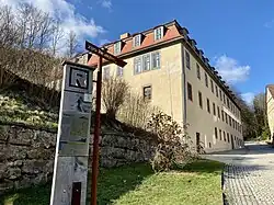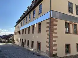 Der dreigeschossige, denkmalgeschützte Barockbau steht am Fuß eines Osthangs. Er prägt das Ortsbild am nördlichen Marktplatz. Die beiden unteren Geschosse haben eine verputzte Fassade aus Bruchsteinmauerwerk, die durch Fenstereinfassungen und Eckquaderungen gegliedert ist. Das Obergeschoss besteht aus einer Fachwerkkonstruktion. Den Abschluss bildet ein Mansarddach mit Dachgauben. Das Gebäude hat einen F-förmigen Grundriss mit einem Südwestflügel, dem langen Südostflügel entlang der Straße und dem inneren, kurzen Nordwestflügel, der das Treppenhaus beherbergt, das den Südostflügel symmetrisch erschließt. Der Nordwestflügel wurde 1790 durch eine Fachwerkkonstruktion erweitert. Ein zweites Treppenhaus befindet sich seit dem Umbau 1881 im Südwestflügel. Ein hölzerner Teepavillon mit einem Figurenpaar stand auf einer Terrasse vor dem Südwestflügel.