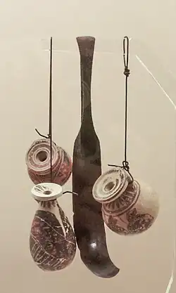 - Hanteln, Schaber (Strigilis), Keramik, Reliefdarstellungen von Athleten zeigen den Abschnitt der Vorbereitung der Athleten.