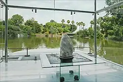 Die symbolische Architektur wird durch den um das Gebäude gelegten eingeschossigen halbkreisförmigen Annexbau mit dem Haupteingang, der Rezeption, dem Bücherladen und dem Teepavillon, welcher durch einen Wassergraben vom Hauptbaukörper getrennt und über offene und geschlossene Stege mit dem Hauptbaukörper verbunden. Den Teepavillon am Ende des halbkreisförmigen Ringbaues erreicht man vom Eingang aus über den Wandelgang des Foyers oder vom Hauptausstellungsgebäude über einen Brückensteg. Wände, Böden, Terrassen und Dächer des gesamten Gebäudes sind innen und außen mit weißem Marmor verkleidet. Die Glasfronten der Glaswände, und Oberlichter werden aus rahmenlosen Glaskonstruktionen gebildet. Zum Park hin wird der Kreisring des Annexbaues durch einen Lichtgraben vom Seeufer mit exotischen Pflanzen getrennt. Das Dach dieses Anbaues bildet eine begehbare Dachfläche, die zugleich als Ausstellungsfläche genutzt wird. In Verlängerung dieses Anbaues ragt aus dem See ein viereckiger zweigeschossiger Turm, gleich einem Signalturm, der durch einen Brückensteg mit diesem verbunden ist. Das Obergeschoss des Turmes besteht aus einem einfachen Stahlrahmen ohne Dach zur Aufnahme der textilen Werbesegel zu der jeweilig stattfindenden Wechselausstellung. Die Ausstellungsflächen werden durch das im See stehende Sockelgeschoss des Haupt- und Annexbaues ergänzt. Zugleich befinden sich die Werkstätten und Depots in diesem Untergeschoss.