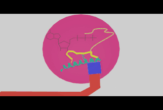 Prinzipielle Vorgänge innerhalb des Myosinkopfes. (Schwarz: ATP; Gelb: Switch-2-Schleife; Grün: Relay-Helix; Blau: Konverterdomäne; Rot: Hebelarm; Rosa: restlicher Myosinkopf.) ACHTUNG: die Strukturen sind nicht detailgetreu, die Animation dient nur der Veranschaulichung der prinzipiellen MechanismenDie Switch-2-Schleife bewegt sich etwas nach oben und zieht dabei an der Relay-Helix, einem weiteren Bestandteil des Myosinkopfes, welche an der Konverterdomäne befestigt ist. Diese ist sehr locker gebunden und überträgt die mechanische Energie auf den Hebelarm, der dadurch in den Myosinkopf gezogen wird.