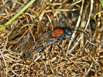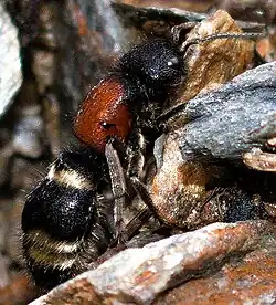 Die Tiere erreichen eine Körperlänge von 10 bis 15 Millimetern (Weibchen) bzw. 11 bis 17 Millimetern (Männchen). Mesonotum und Scutellum sind meist rot, seltener schwarz gefärbt. Der übrige Körper ist schwarz gefärbt, am Hinterleib befinden sich drei Binden mit weißer Behaarung. Das zweite Tergit ist grob und dicht punktiert. Die Beine sind schwarz behaart. Weibchen besitzen deutlich kleinere Facettenaugen. Zwischen dem dritten und vierten Tergit ist ein Stridulationsorgan ausgebildet, mit dem die Tiere durch Gegeneinanderreiben Töne erzeugen können.