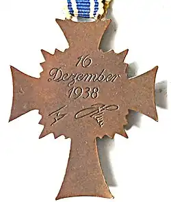 Das Ehrenkreuz der Deutschen Mutter, kurz Mutterkreuz, wurde am 16. Dezember 1938 per Verordnung von Adolf Hitler gestiftet. Der Entwurf des Ehrenkreuzes stammt von Franz Berberich. Die Eingangsworte dieser Verordnung lauteten: „Als sichtbares Zeichen des Dankes des Deutschen Volkes an kinderreiche Mütter stifte ich das Ehrenkreuz der Deutschen Mutter.“[1] Die weiteren Verfahrensregeln wurden in der gleichnamigen Satzung veröffentlicht. Im Volksmund wurde der Orden auch „Karnickelkreuz“ genannt.[2]