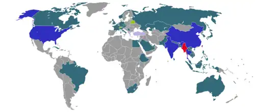 In Myanmar galt offiziell noch bis 2013 das angloamerikanische Maßsystem, das weltweit sonst nur von den USA und Liberia verwendet wird. 2013 wurde der Übergang zum metrischen System beschlossen.[34]