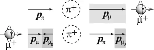 - Vorwärtsemittierte Myonen: Das Myon wird in Flugrichtung des Pions emittiert. Im Ruhesystem des Pions addieren sich die Impulse von Pion und Myon. Der Myonenimpuls im Laborsystem ist somit größer als der des emittierenden Pions und besitzt die gleiche Richtung wie im Ruhesystem. Die Orientierung der Spinpolarisation bleibt damit erhalten: Vorwärtsemittierte Myonen sind rückwärts polarisiert.