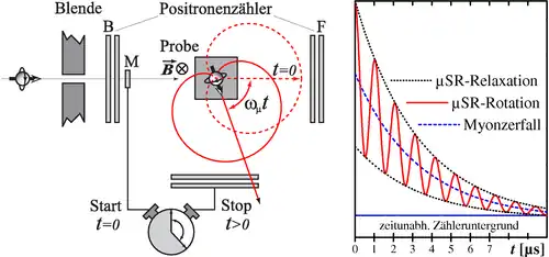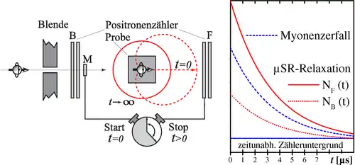 Ein polarisierter Myonenstrahl wird durch eine Strahlblende kollimiert und in der zu untersuchenden Materialprobe gestoppt. Der Durchgang eines Myons durch den Myonen-Detektor legt den Zeitnullpunkt der Implantation fest. Das Zerfallspositron wird mit Hilfe der um die Probe angeordneten Positronenzähler erfasst und liefert das Stopp-Signal.