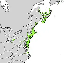 Myrica pensylvanica kommt im östlichen Nordamerika von Neufundland westwärts bis Ontario und Ohio und südwärts bis nach North Carolina vor.
