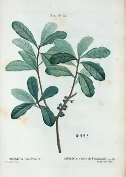 - ↑ a b c d e f g h Allan J. Bornstein: Myricaceae. In: Flora of North America Editorial Committee (Hrsg.): Flora of North America North of Mexico, Volume 3 – Magnoliidae and Hamamelidae, Oxford University Press, New York und Oxford, 1997, ISBN 0-19-511246-6. Myrica pensylvanica Mirbel in H. Duhamel du Monceau et al. – textgleich online wie gedrucktes Werk.