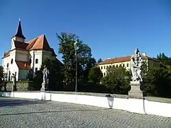 - Barocke Kirche des hl. Johannes des Täufers (1641) mit Heiligenstatuen von Adolf Loos vor der Kirche