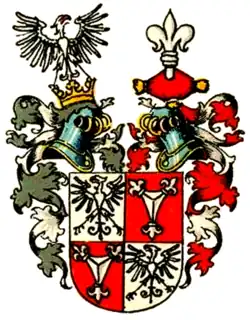 - Das Wappen von 1548 ist geviert, in 1 und 4 in Silber ein schwarzer Adler, in 2 und 3 in Rot ein gestürztes silbernes Dreieck, an den Spitzen halbe silberne Lilien. Zwei Helme, rechts mit schwarz silbernen Decken der schwarzen Adler, links der Stammhelm.