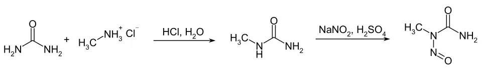 Die Darstellung der Verbindung erfolgt aus Harnstoff, Methylamin und Natriumnitrit.[3][1] Zunächst wird in einer Substitutionsreaktion N-Methylharnstoff gewonnen. Die Zielverbindung ergibt sich durch eine anschließende saure Nitrosierung.