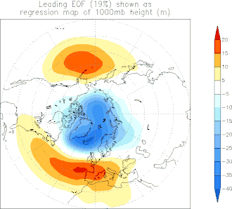 Moderne Varianten[5] beruhen auf numerischen Wettermodellen und berücksichtigen die Gesamtklimasituation. Dabei wird das langjährige Monatsmittel der 500-hPa-Höhenanomalie im Atlantikraum ab 20° nördlicher Breite bis zum Nordpol gebildet, eine statistische Hauptkomponentenanalyse für die mittlere Lage der Luftmassen durchgeführt (Emperical Orthogonal Function, EOF und Rotated Principal Component Analysis, RPCA), und darüber die Varianz ermittelt. Der NAO-Index ist die interpolierte mittlere tägliche Abweichung von diesem monatlichen Basiswert. Diese Methodik berücksichtigt auch die Einflüsse aller anderen bekannten Telekonnektionsmuster.