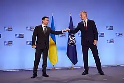 Unter Präsident Wolodymyr Selenskyj wurde die Ukraine am 12. Juni 2020 in das Enhanced Opportunities Program der NATO aufgenommen, wobei die Interoperabilität der ukrainischen und der NATO-Streitkräfte gestärkt wurde und die Ukraine zu einem der engsten Partner der NATO aufstieg.[30] 2021 wurde auf dem NATO-Gipfel in Brüssel eine „Politik der offenen Tür“ für die Ukraine und Georgien beschlossen.[31]