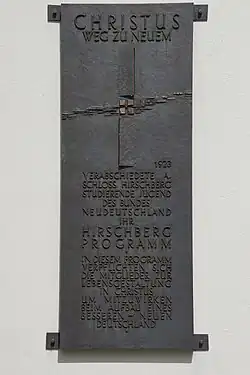 Gedenktafel auf Schloss Hirschberg « Christus weg zu Neuem. 1923 verabschiedete am Schloss Hirschberg studierende Jugend des Bundes Neudeutschland ihr Hirschberg Programm. In diesem Programm verpflichten sich die Mitglieder zur Lebensgestaltung in Christus um Mitzuwirken beim Aufbau eines besseren – Neuen Deutschland. »