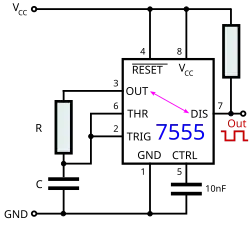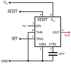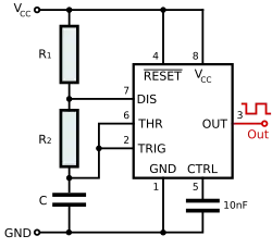 Der Puls beginnt, wenn der NE555-Timer ein Signal am Trigger-Eingang empfängt. Das ist dann der Fall, wenn die Spannung am Trigger-Eingang unter 1⁄3 der Versorgungsspannung fällt. Die Breite des Ausgangsimpulses wird über die Zeitkonstante eines externen RC-Netzwerks festgelegt, das aus einem Kondensator C und einem Widerstand R, wie in nebenstehender Schaltskizze dargestellt, besteht. Der Ausgangsimpuls endet, wenn die Spannung am Kondensator 2⁄3 der Versorgungsspannung entspricht, vorausgesetzt, der Triggerimpuls endete zuvor. Die Impulsbreite τ des Ausgangsimpulses kann durch Anpassen der Werte von R und C nach folgender Gleichung verändert werden:[6]
