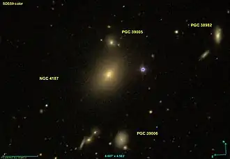 | NGC 4187 • UGC 7229 • PGC 39004 • CGCG 269-042 • MCG +09-20-117 • 2MASX J12132932+5044292 • GC 2782 • H II 813 • Holm 347A | |