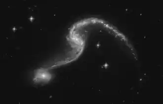 | Aufnahme der gravitativ interagierenden Galaxien NGC 646 und (kleiner) PGC 6014 mithilfe des Hubble-Weltraumteleskops | |