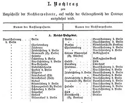 Der Geltungsbereich der Ortstaxe wurde auf Grund der „Bestimmungen über das Postswesen“[2] auf den Nachbarortsverkehr ausgedehnt. Die Postordnung von 1900 regelte dies: