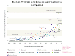 Zum Problem der Lebensfähigkeit der Menschheit auf dem Planeten kommt ein Gerechtigkeitsproblem hinzu: Die Armen leiden am meisten unter der Umwelt- und Klimakrise, und es ist zu befürchten, dass der Wunsch der am wenigsten entwickelten Länder und Entwicklungsländer nach Wachstum hin zu einem ähnlichen Wohlstandszustand wie die hoch entwickelten Länder, eine noch größere und schnellere Verschlechterung des menschlichen Lebensraums und der Biosphäre mit sich bringt. Wenn beispielsweise alle Staaten der Erde den American Way of Life übernehmen würden (der für 5 % der Bevölkerung fast 25 % der Ressourcen der Erde verbraucht), bräuchte man laut der Umweltorganisation WWF fünf Planeten, um die Bedürfnisse aller Menschen zu befriedigen.[24]